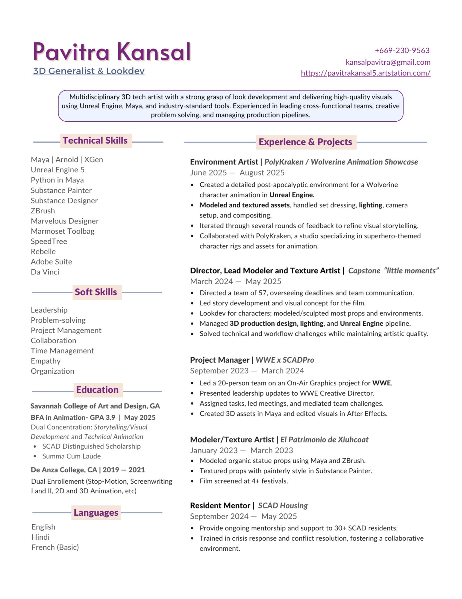 Hey there! I’m a multidisciplinary 3D tech artist and SCAD grad who’s passionate about crafting beautiful visuals and bringing stories to life. I love diving deep into look development and creating immersive environments.I’ve had the chance to lead awesome cross-functional teams, tackle creative challenges, and manage complex production pipelines—all while learning tons along the way.Right now, I’m based in Austin, Texas, but I’m open to relocating anywhere new and exciting. When I’m not in front of a screen, you’ll find me dancing, hitting the gym, going for drives, or just hanging out with family and friends.For business inquiries and collaboration, please contact [email protected]