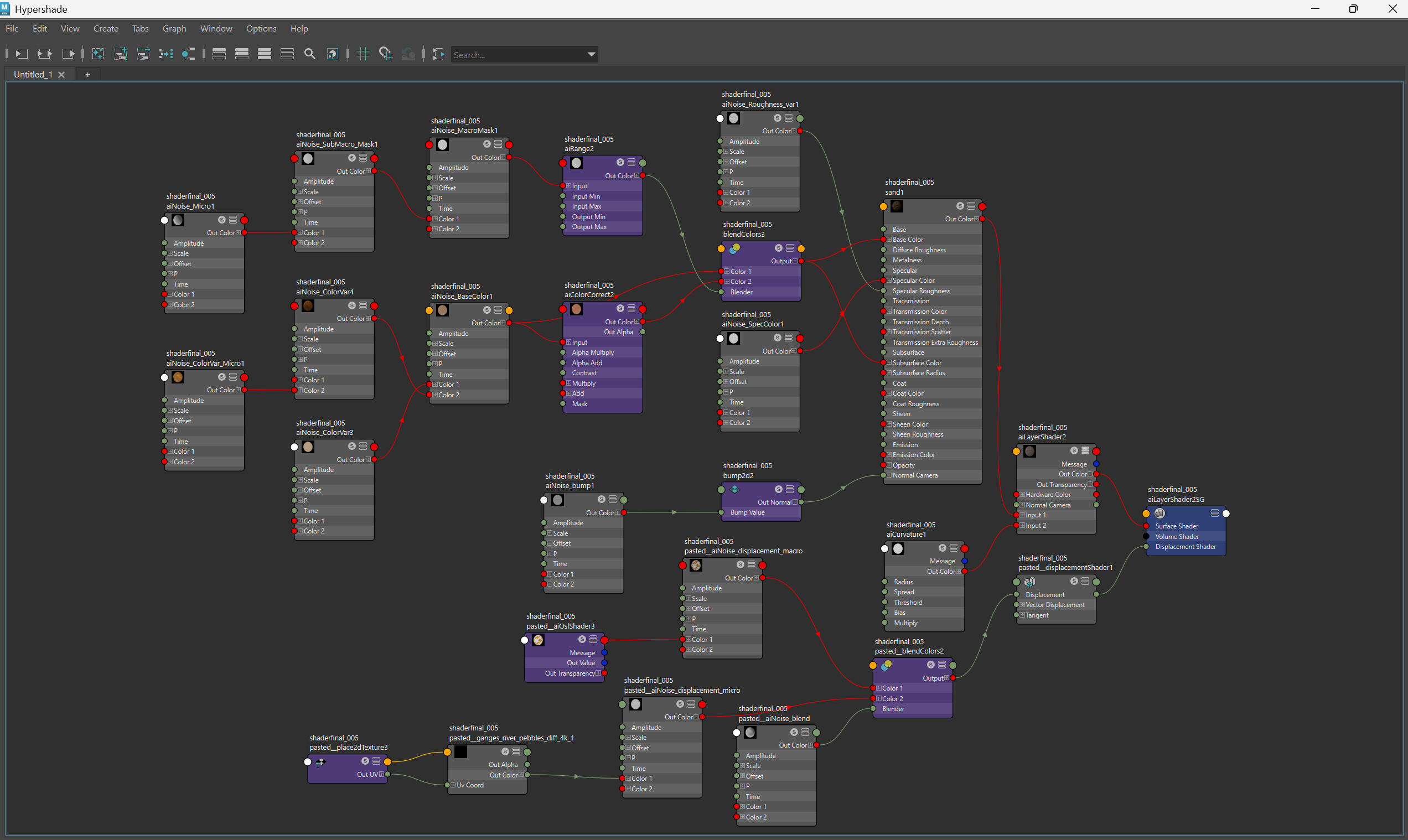 Maya Hydershade network for sand shader applied on sandcastle and ground